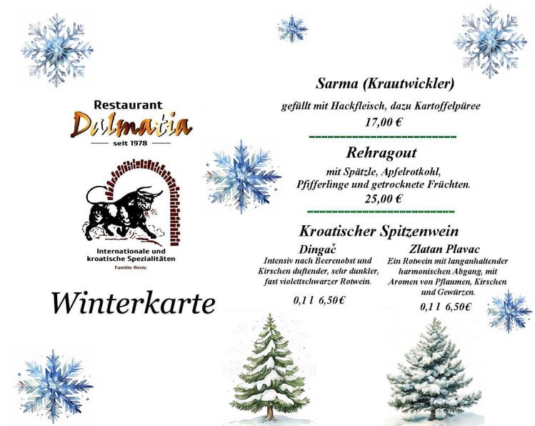 -------------------------------------------Montags von: 11:30 - 14:30 / 17:30 - 22:00 UhrMittwochs bis Samstags von: 11:30 - 14:30 / 17:30 - 22:00 UhrSonntags und Feiertage von: 11:30 - 21:00 Uhr------------------------Tischreservierung "online" oder per Telefon!!Für weitere Fragen können Sie uns gerne anrufen.Tel: 02352-50566Wir freuen uns auf Sie!Ihr Dalmatia Team!